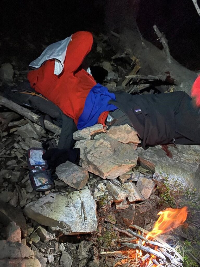 The extra layers helped a little, but my trembling continued. Wisely, my friends decided to build a small fire on the rocks below me. They found some sticks and a piece of paper for kindling. After several failed attempts with the lighter, they were finally successful. The warmth from the fire was a welcome relief that helped me begin to control the trembling.