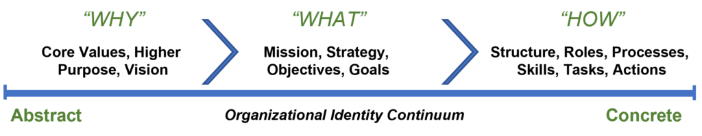 Once an organization’s leaders come to grips with a new reality, they must quickly identify new objectives. This new goal should be based on their deeper bedrock purpose (the why). With their new objective clear (the what), organizational members can begin to figure out how to achieve the goal. They do this by redefining the work to be done on the right side of the identity continuum. (See below).